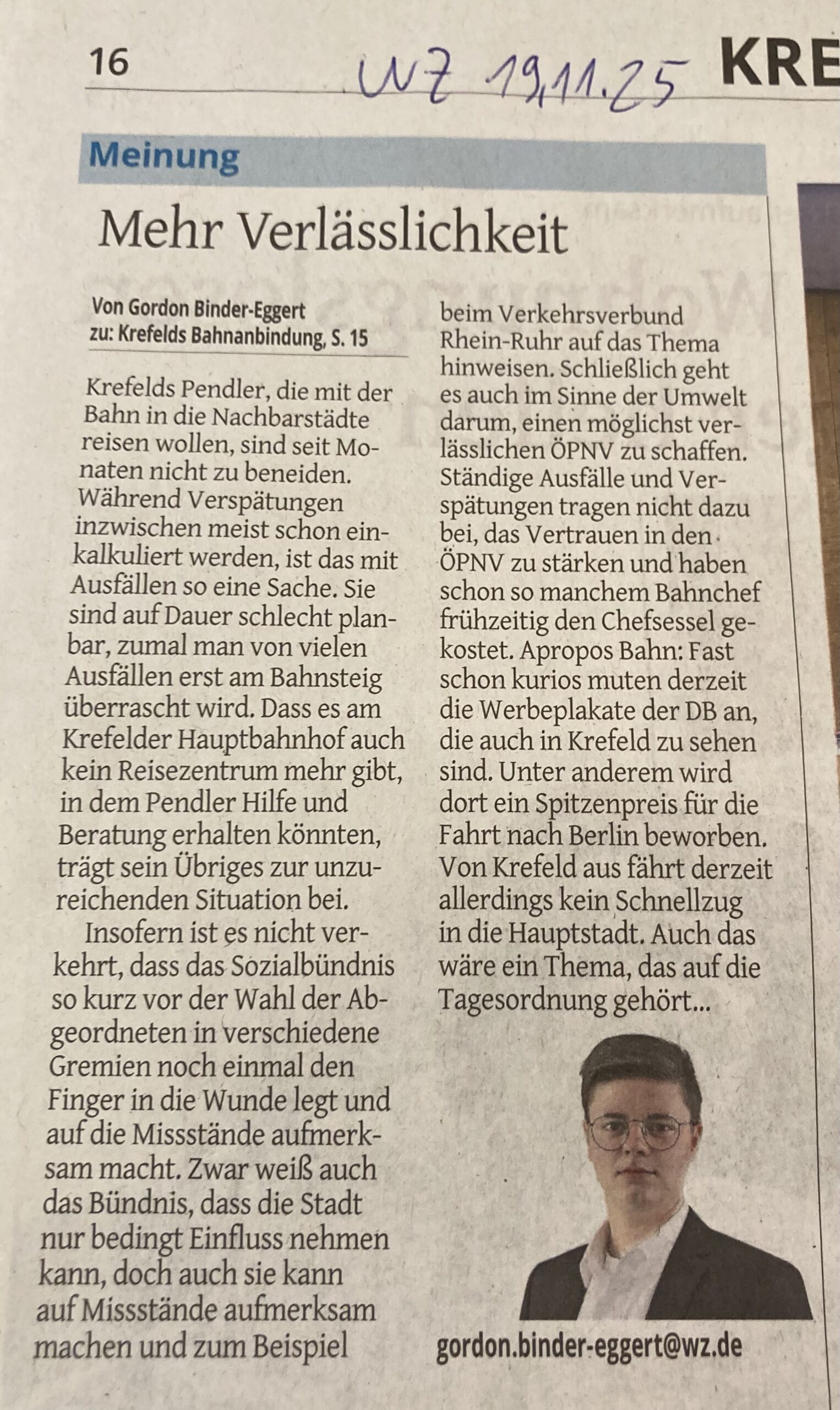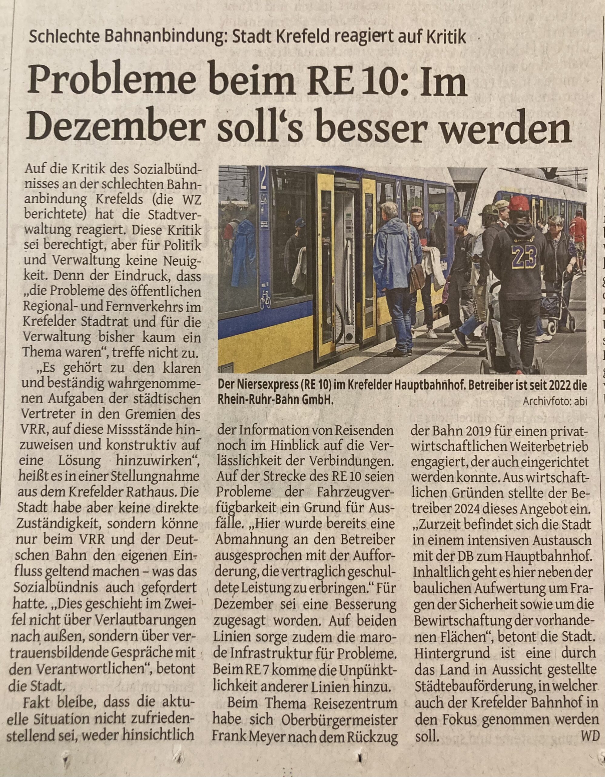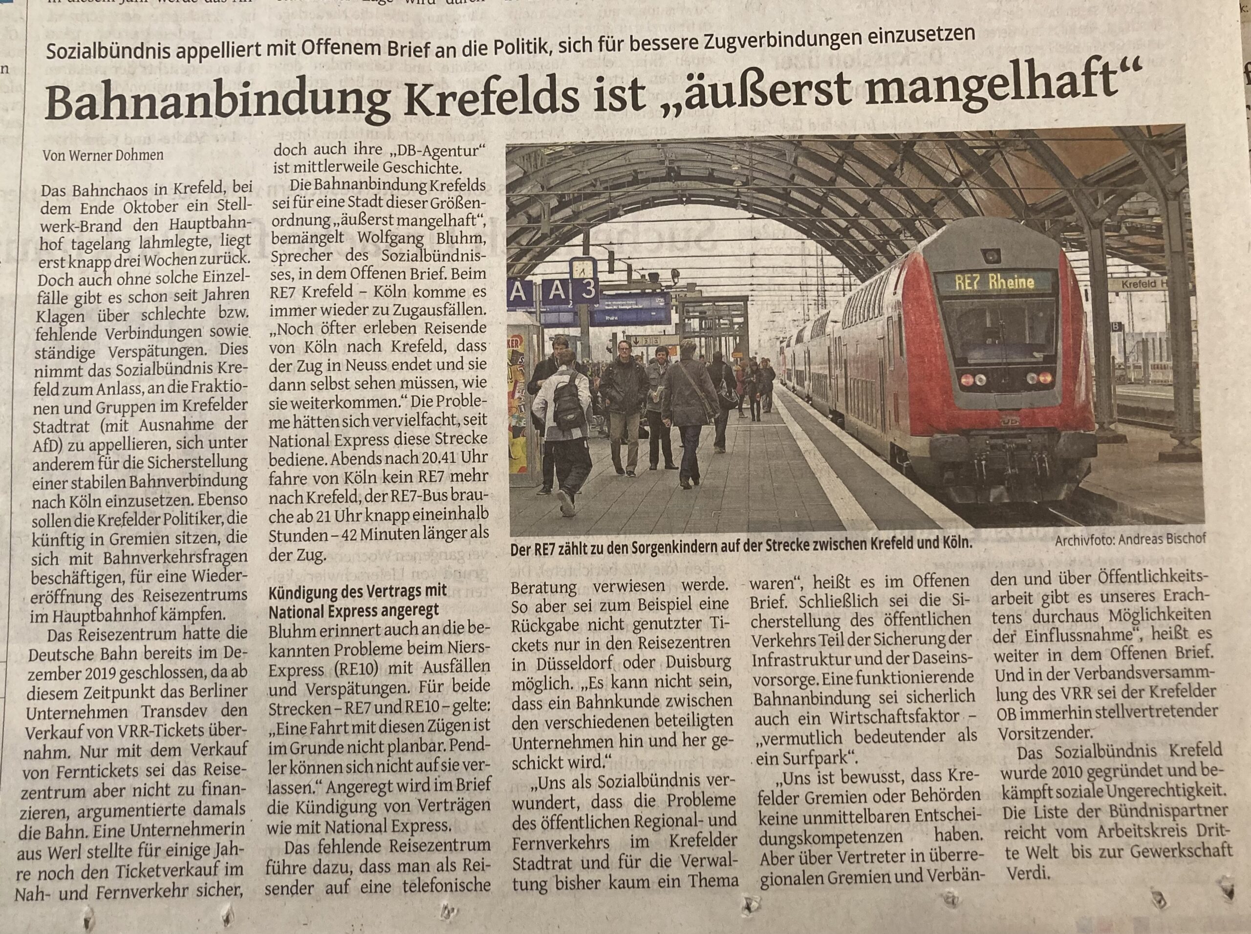 Brief zur mangelhaften Bahnanbindung Krefelds