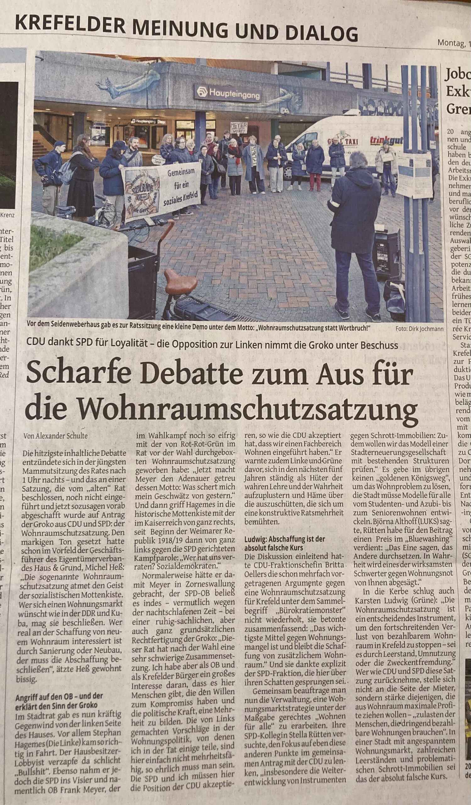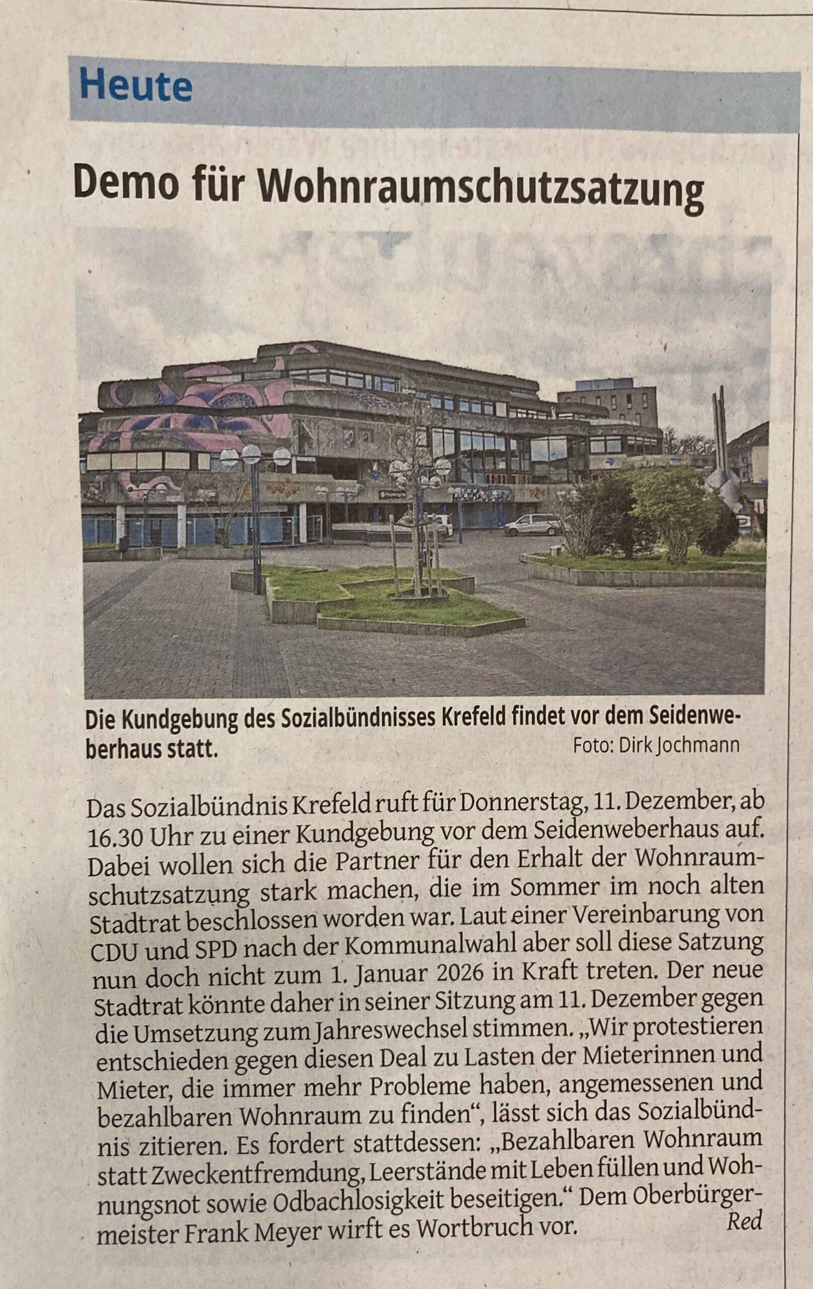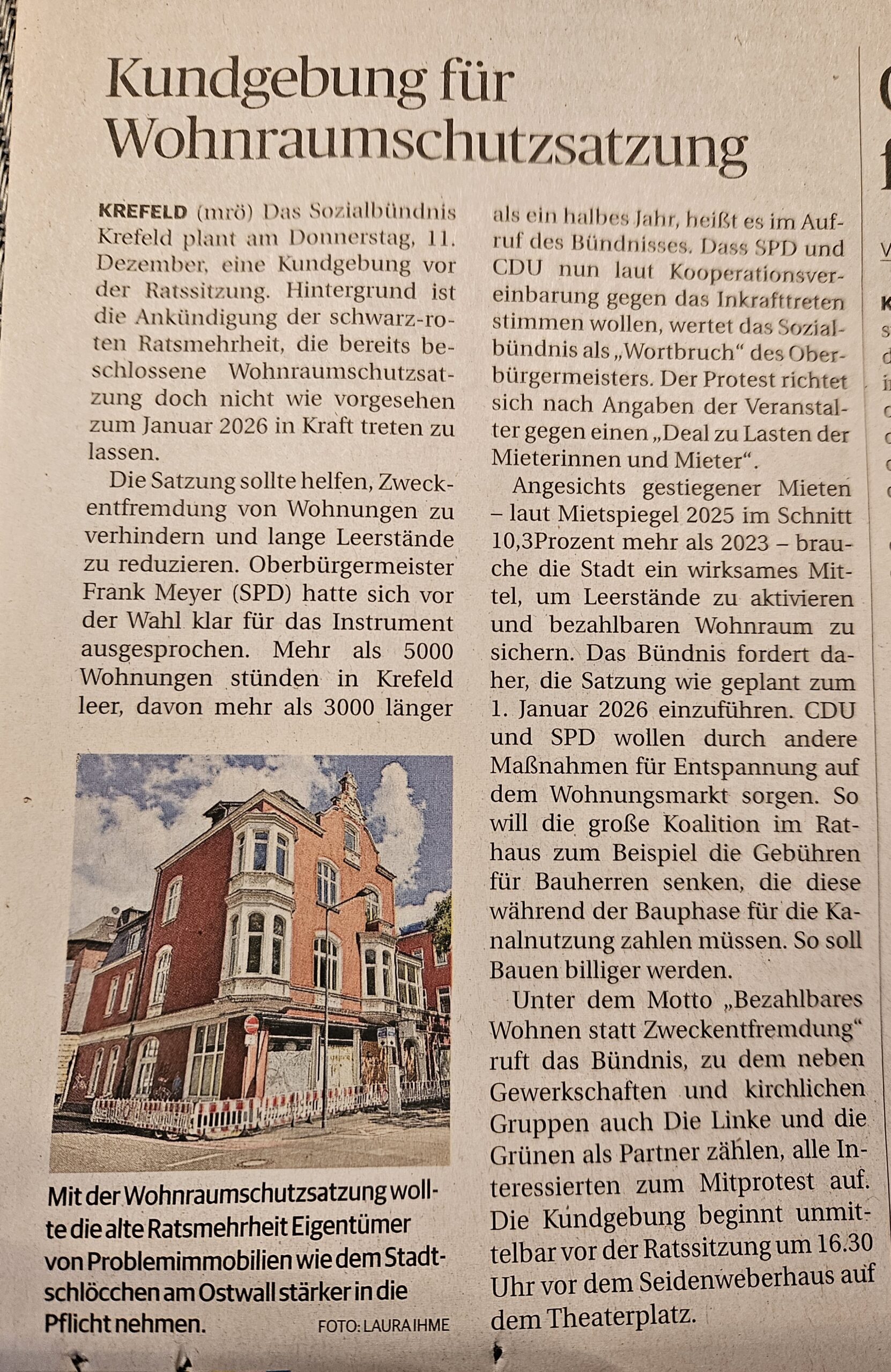 Das Sozialbündnis Krefeld fordert das Inkrafttreten der Wohnraumschutzsatzung zum 1.1.26!